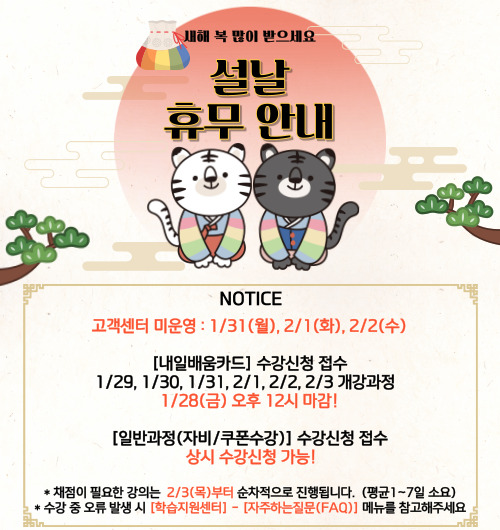 1/29(토), 1/30(일), 1/31(월), 2/1(화), 2/2(수), 2/3(목)에 개강되는 건은 1/28(금) 오후12:00까지 신청가능 합니다.